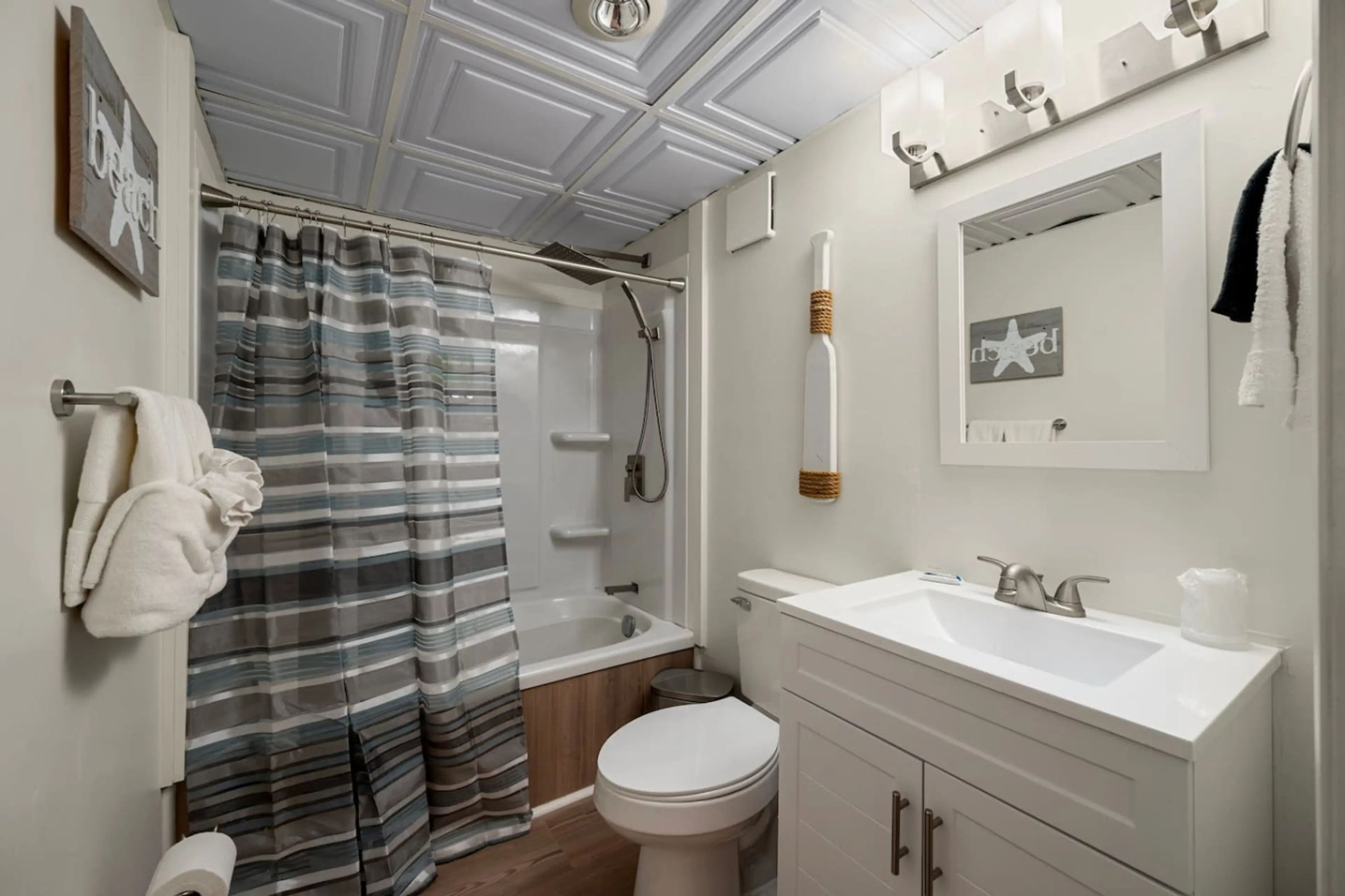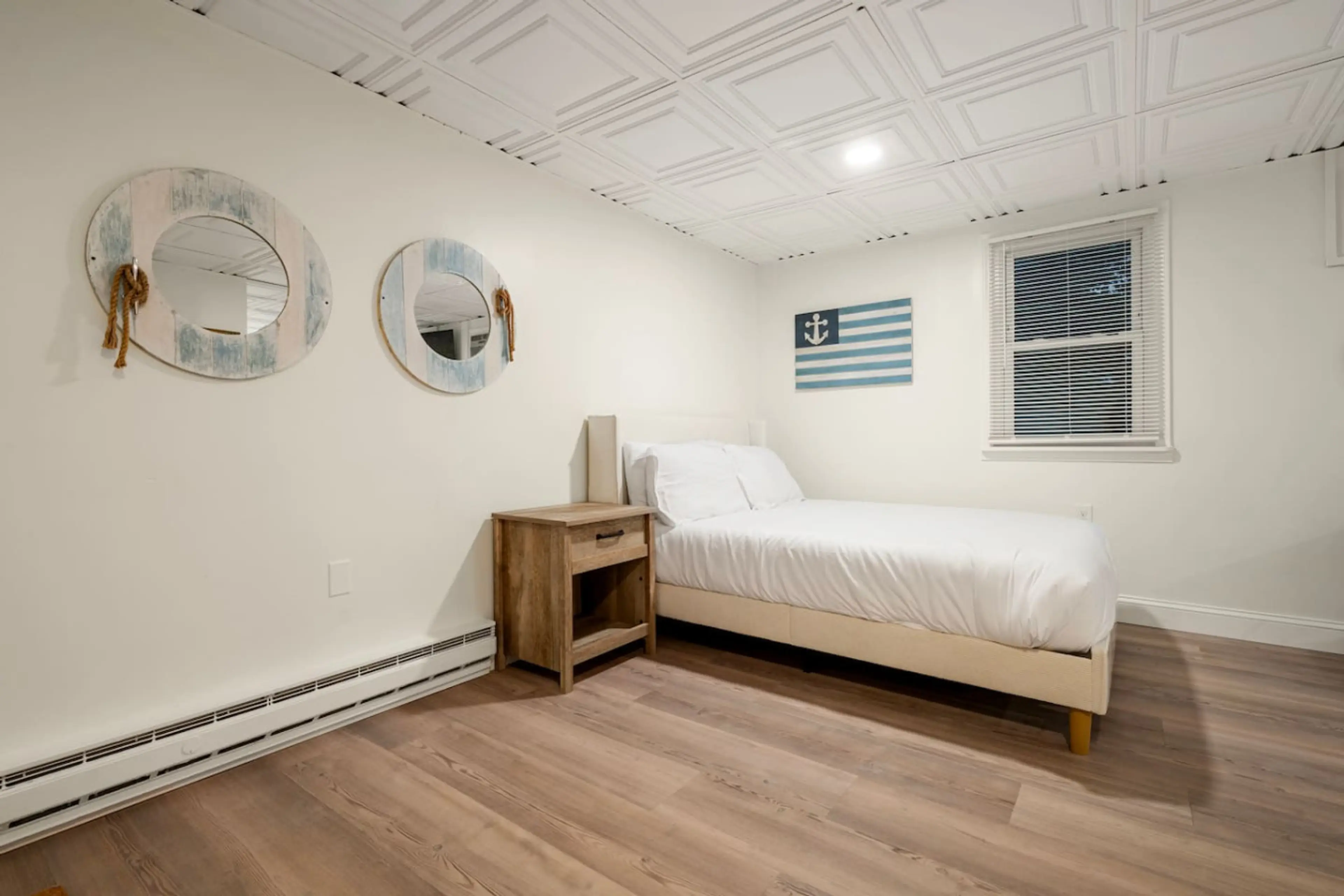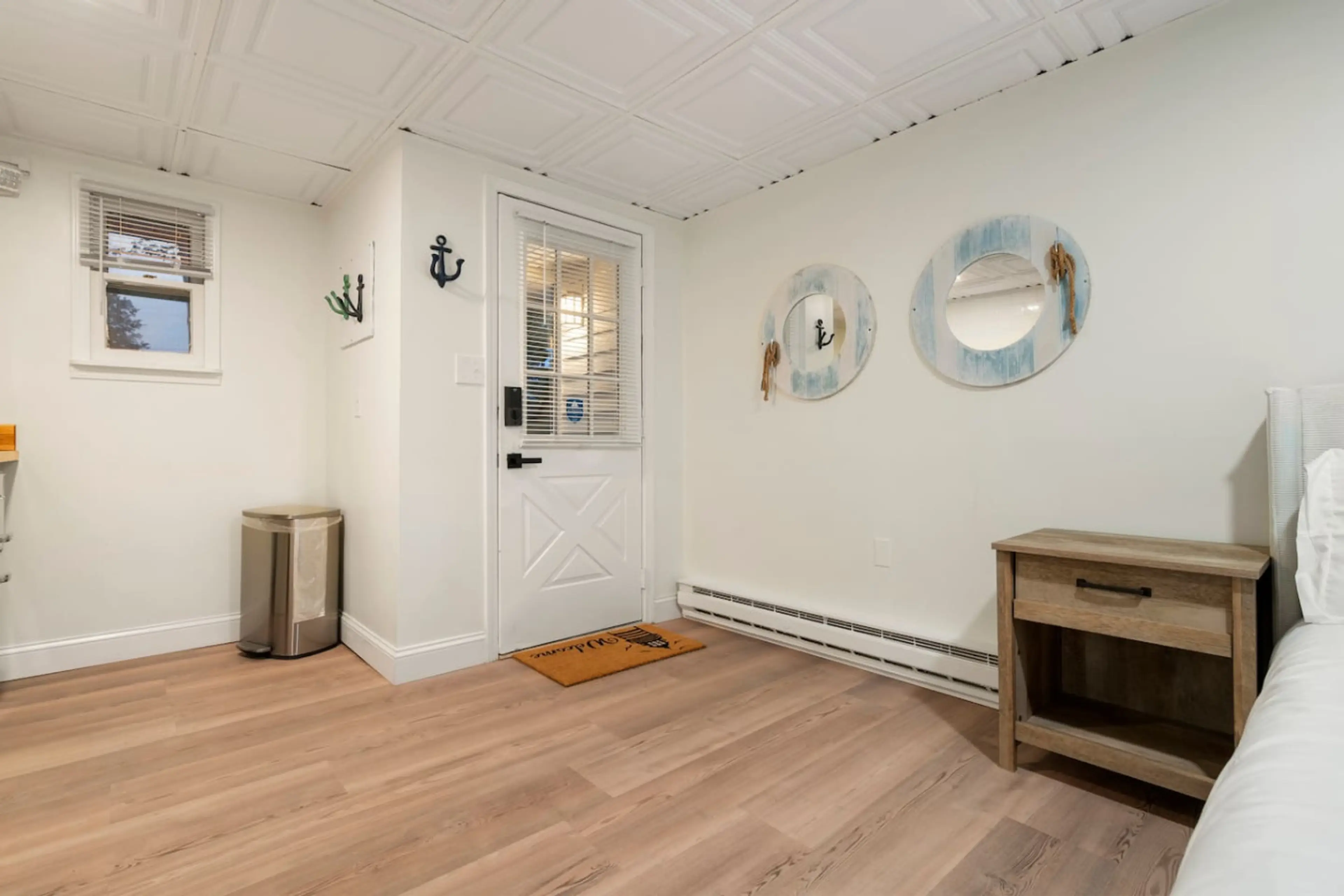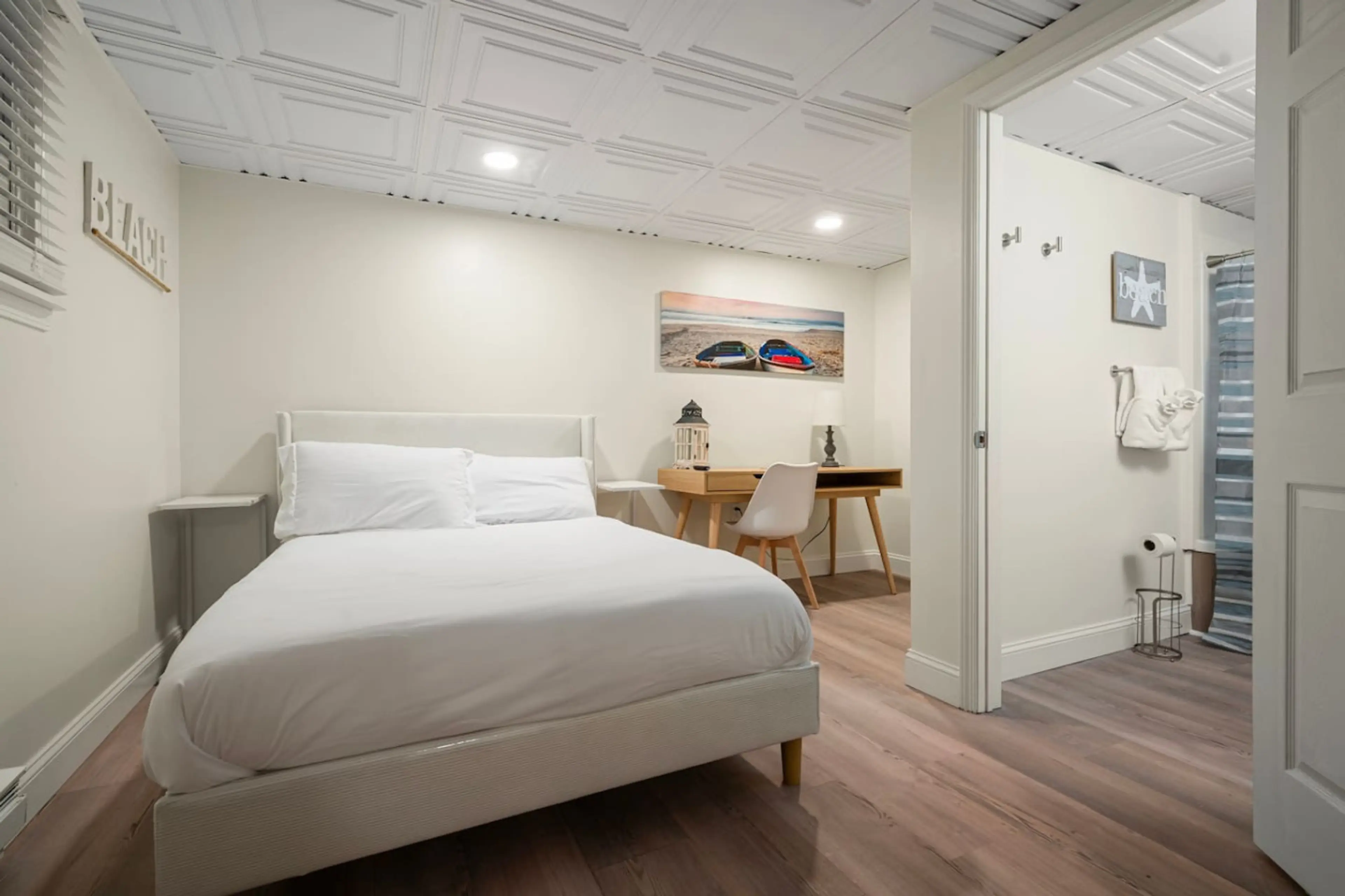 "Boardwalk Bungalow" at The Beachside – Just a 1-minute stroll from the sand, steps from Sylvan Beach Amusement Park, Lake House Casino, and restaurants. Remodeled in 2025 with all-new everything! This unit features 2 Full size beds, kitchenette with Keurig, bathroom shower with jetted tub, hairdrye...